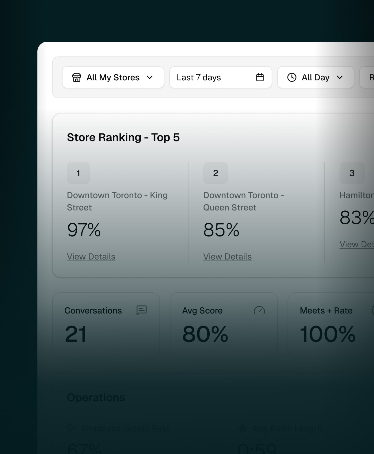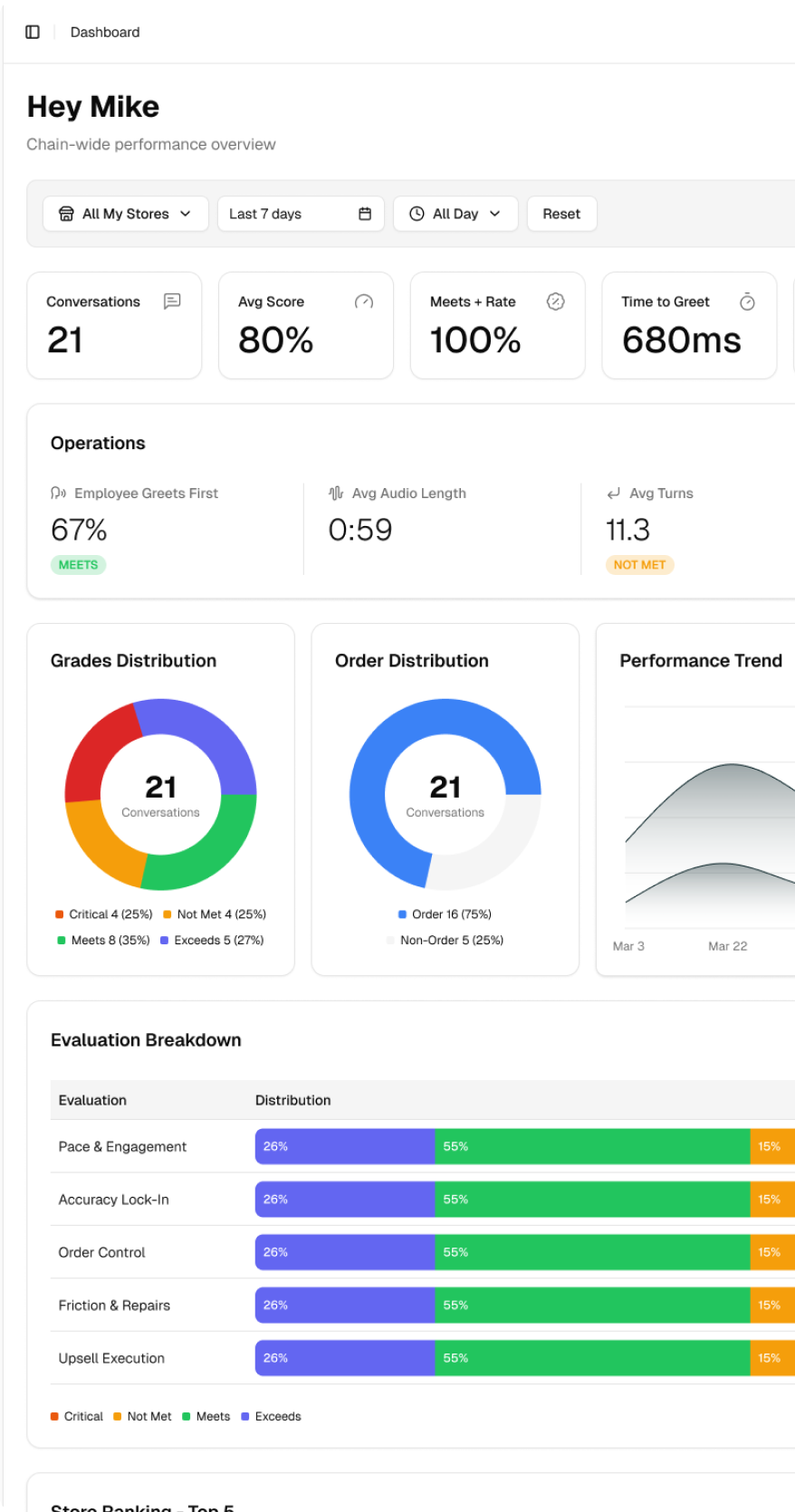 Shift/store/chain views with trends, comparisons, rankings, and denominator transparency.